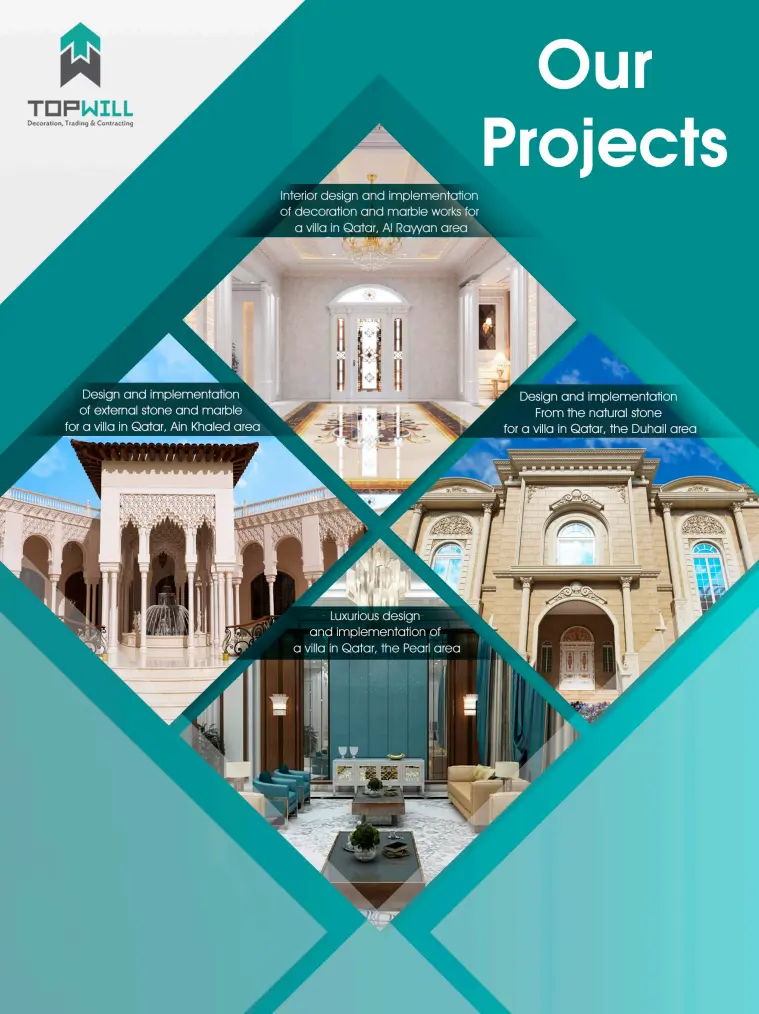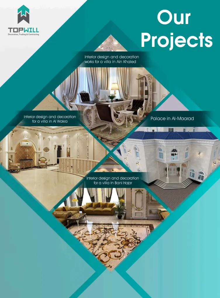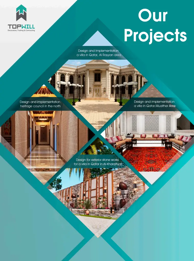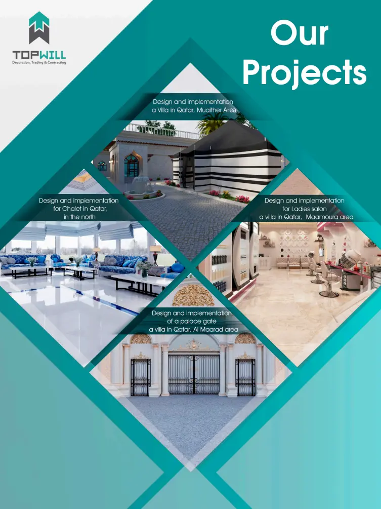 شركة توب ويل قطر متخصصة في مجال الديكور والمقاولات و تقديم خدمات بناء مبتكرة في الديكور والتصميمات الداخلية والخارجية ذات جودة عالية داخل دولة قطر، و بفضل خبرتنا الطويلة وفريق العمل المؤهل على أعلى مستوى من الإحترافية، نسعى جاهدين لتحقيق تطلعات عملائنا وتجاوز توقعاتهم في تنفيذ كافة المشاريع، كما نفتخر بالتزامنا بالمهنية والجودة و نسعى دائمًا لتحقيق أعلى معايير الأداء لنيل رضا العملاء وتحقيق كافة أحلامهم.